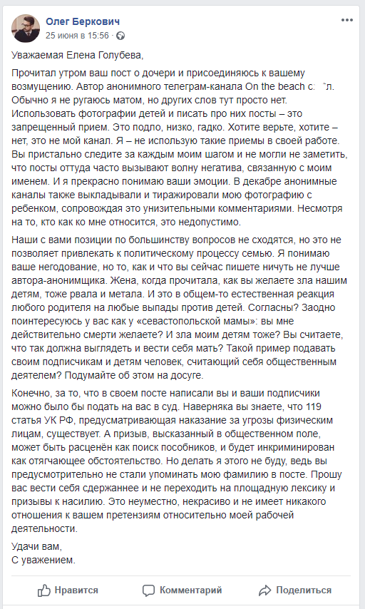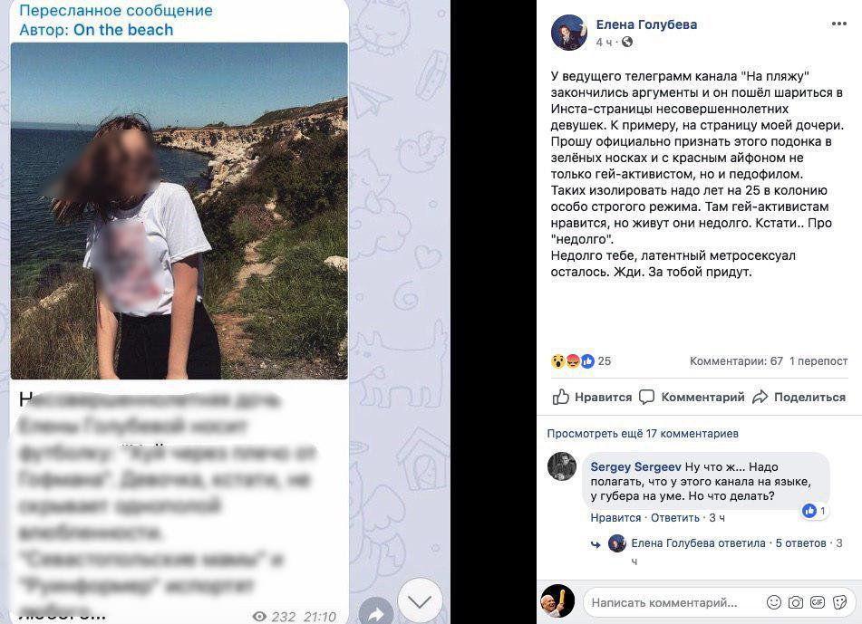 Голубева в долгу не осталась - и севастопольский сегмент фейсбука вскипел оскорблениями и проклятиями в адрес автора и его семьи.