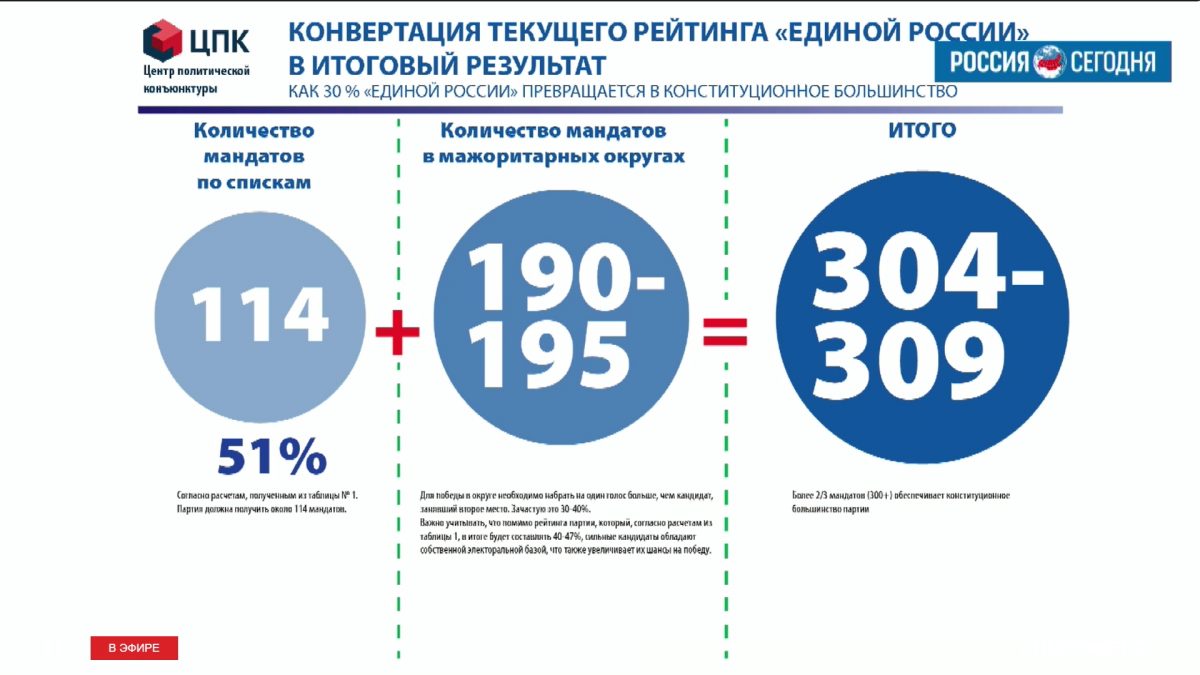 Также Чеснаков заявил, что если добавить эти цифры к количеству мандатов по мажоритарным округам, то «Единая Россия» способна получить 304-309 мест .