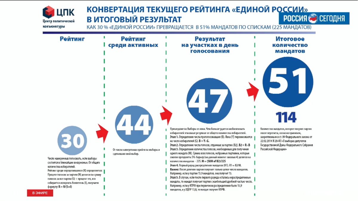 В ходе круглого стола он представил слайды, на которых проиллюстрированы его высказывания. Политолог объяснил, каким образом текущие 30% рейтинга единороссов превратятся в 51% мандатов по итогам выборов.