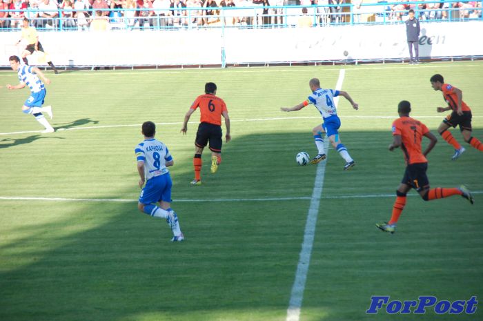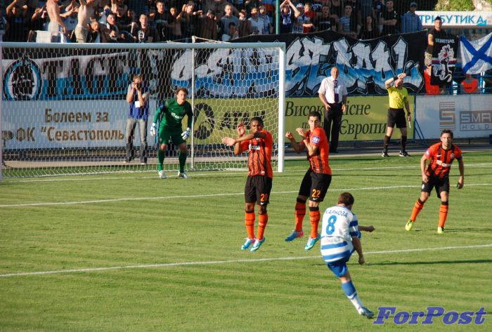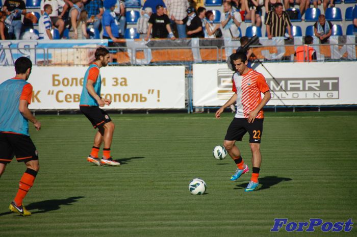 В первые минуты матча севастопольцы начали резво и даже заработали угловой у ворот соперника. Но «Шахтер» достаточно быстро перехватил инициативу в свои руки. Уже на 9-й минуте наши защитники оставили в штрафной без присмотра Луиса Адриано, который тут же и наказал за невнимательность, забив гол метров с 15-ти.