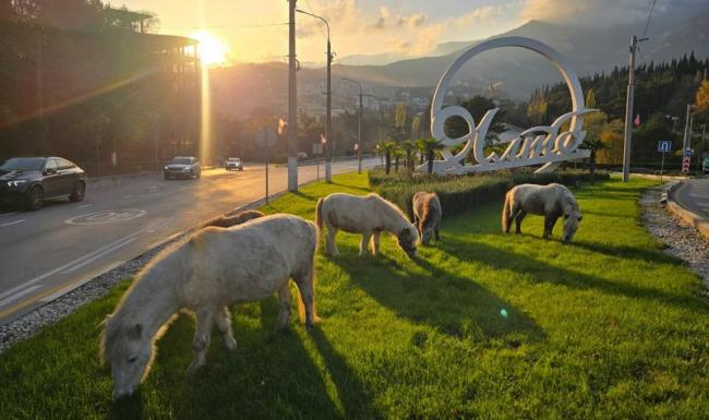 Небольшое стадо пони сегодня утром едва не стало причиной дорожного затора на юге Крыма: милые копытные в поисках свежей зелени облюбовали клумбу, находящуюся прямо рядом с въездом в Ялту со стороны Алушты. Кто несёт ответственность за подобных умилительных, но непрошеных гостей, разбирался ForPost.