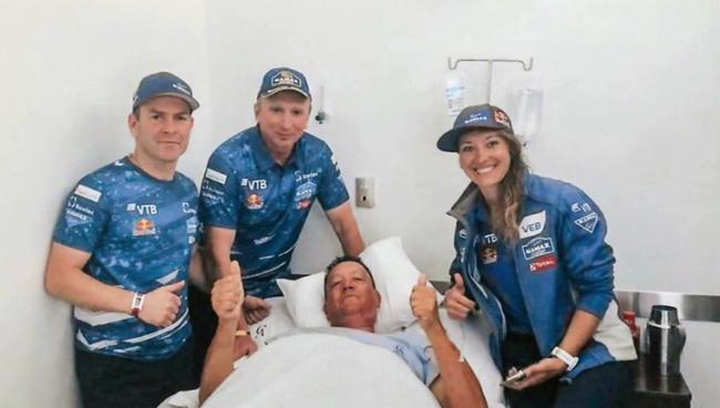 В палату к 60-летнему мужчине из ЮАР приехали руководитель команды КамАЗа Владимир Чагин, пилот Андрей Каргинов и врач Ирина Зеленкова. Правда, болельщик отказался от любой видеосъемки, поэтому на память от встречи есть лишь одно фото.