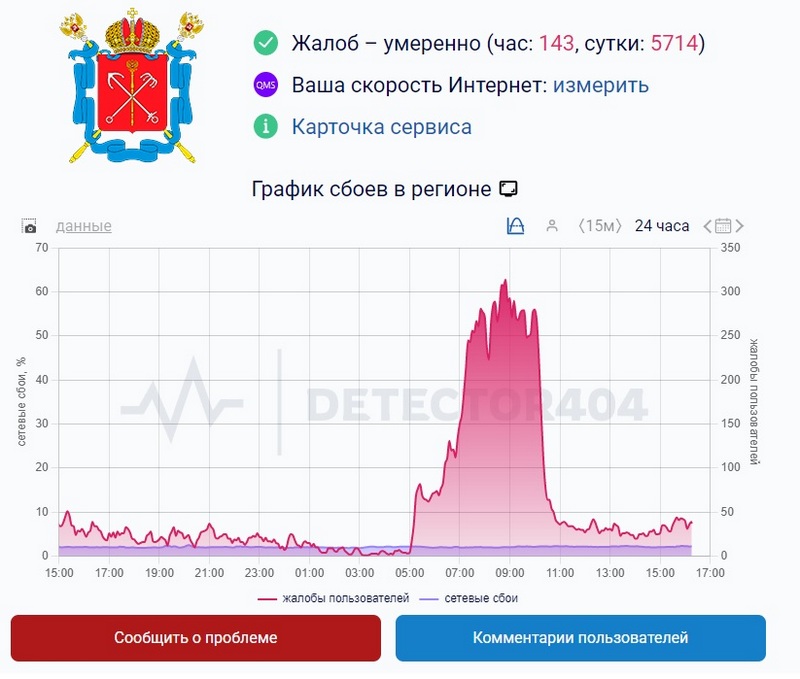 По данным платформы Detector404, число жалоб на сбои в работе интернета в Санкт-Петербурге начало стремительно расти в 5 утра, достигнув пика примерно к 9 часам. Проблемы, судя по графику, наблюдались примерно до 10 часов утра, после чего количество жалоб начало снижаться, и уже к 11 часам вернулось к обычным показателям.
