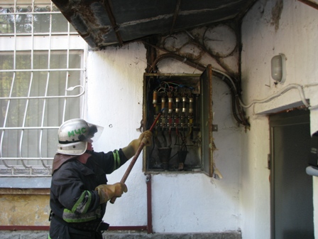 Как оказалось, горела электрическая проводка, в подъезде дома стоял едкий запах горящего поливинилхлорида. Приступить сразу к тушению возгорания не представлялось возможным, так как здание находилось под напряжением. Спасатели надели специальное оборудование и вошли в задымленное помещение. Их коллеги при помощи специального инструмента вскрыли электрощиток и вынули из него предохранители, тем самым обесточив весь дом.