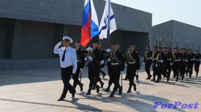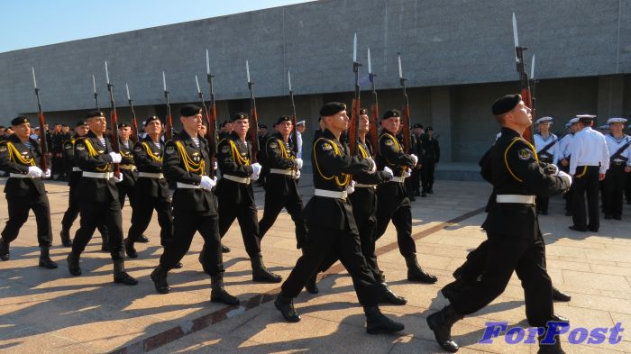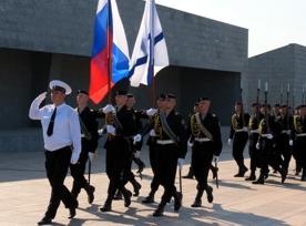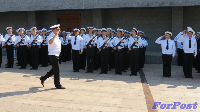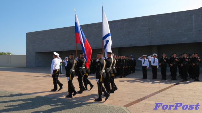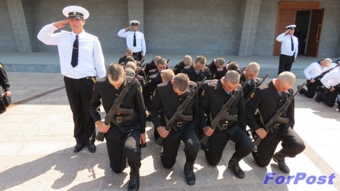 Звучит Гимн России, чеканя шаг проходят парадные «коробки» черноморцев. «Минута молчания». Молодые воины склоняют колени перед памятью тех, кто не пожалел жизни за Родину, за родной Севастополь.