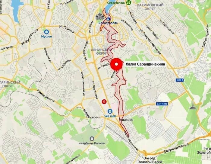 Рядом с двумя вокзалами Севастополя располагается одна из самых глубоких и протяженных балок в городе. По ней можно добраться до нынешней развязки на 10-м километре. Название, как было принято в XIX веке, балка получила благодаря владельцу хутора. Звали его Евстафий Сарандинаки.