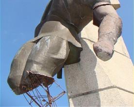 Екатерина, если памятник литой, или из цельного куска гранита или мрамора, то он может простоять сотни лет, а судя по фотографиям, он выполнен из металлического каркаса (арматуры) на которой держались бронзовые пластины. Если арматура проржавела, то такая конструкция легко может рассыпаться под тяжестью собственного веса...