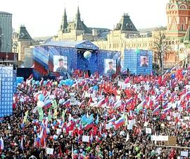 В ситуации с вхождением Крыма в состав РФ российский народ продемонстрировал собранность и патриотизм в поддержке крымчан и севастопольцев, выразивших желание «вернуться к родным берегам». Об этом заявил президент России Владимир Путин, выступая на праздничном митинге в Москве в честь первой годовщины воссоединения Крыма с Россией.