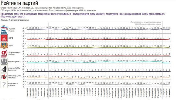 Стремительно растёт число тех, кто не пойдёт на выборы. Если, по данным ФОМ, за 20 декабря 2020 года таковых было 5%, то по данным на 31 января 2021 года — уже 15%.