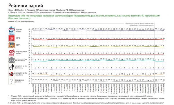 Если бы в ближайшее воскресенье состоялись выборы в Государственную думу РФ, то за «Единую Россию» отдали бы голоса 29% избирателей. Такие данные приводятся в опросе Фонда Общественное мнение (ФОМ), который проводился с 5 по 7 февраля 2021 года. В нём приняли участие три тысячи респондентов из 73 субъектов РФ.