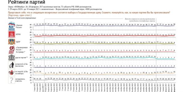 Если бы в ближайшее воскресенье состоялись выборы в Государственную думу РФ, то за партию «Единая Россия» проголосовали 32% участника опроса Фонда Общественное мнение (ФОМ). Опрос проводился с 26 по 28 февраля 2021 года. В нём приняли участие три тысячи респондентов из 73 субъектов РФ, в 207-ми населённых пунктах.
