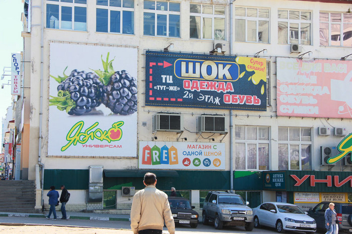 А, эта реклама, что на этих фотографиях, даже не сама по себе ужасна, а суть в том, что изуродовали город и проспект Октябрьской Революции сами "курятники" бездумно и алчно настроенные на газонах проспекта!