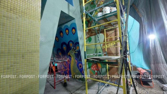 По словам собеседника ForPost, он с командой прибыл в Симферополь из Казани два месяца назад. С тех пор они с нуля заново выкладывают стилизованные детские рисунки на четырёх буквах «П», «А», «Р» и «К» вместо мультяшных сюжетов, которые были до этого. Работают не традиционной для мозаики смальтой (кусочки цветного стекла — Прим.), а специальной мозаикой, которую фирма сама изготавливает в столице Татарстана.