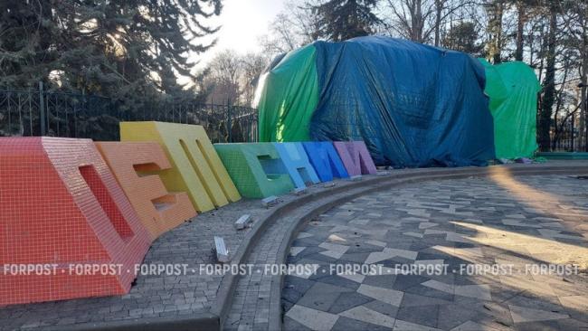 Визитная карточка Детского парка — гигантские буквы, служащие центральным входом в зону отдыха, — до сих пор спрятаны под непроницаемым материалом.