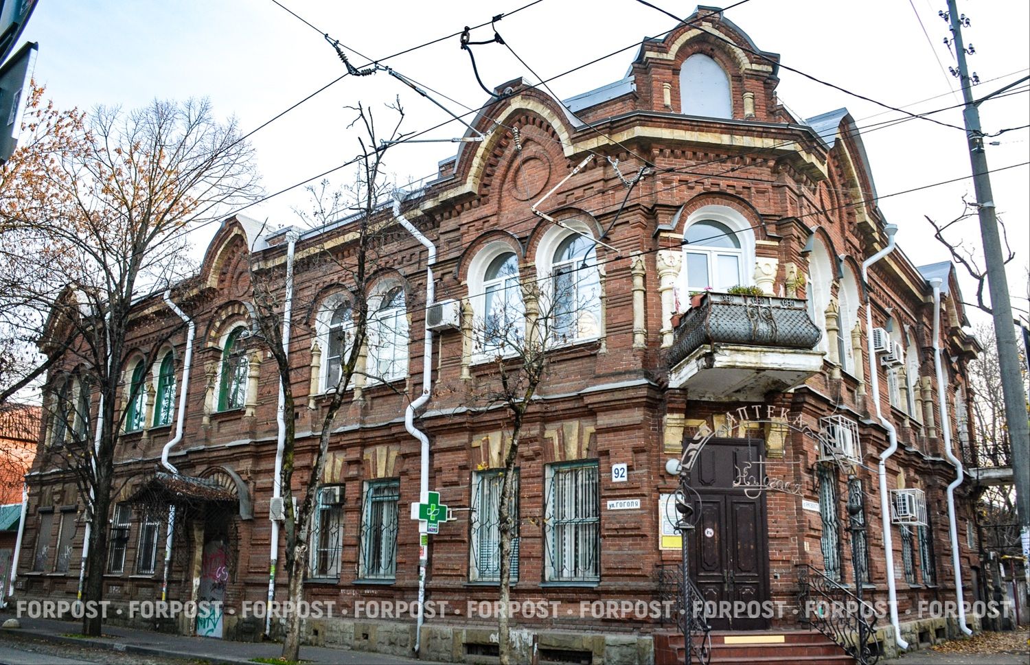 На улице Комсомольской, 43 стоит мини-брат богарсуковской «Централи» — бывший дом одного из уважаемых и добросовестных нотариусов Екатеринодара Егора Никифораки. Оба объекта построены по проектам одного архитектора — Александра Козлова.