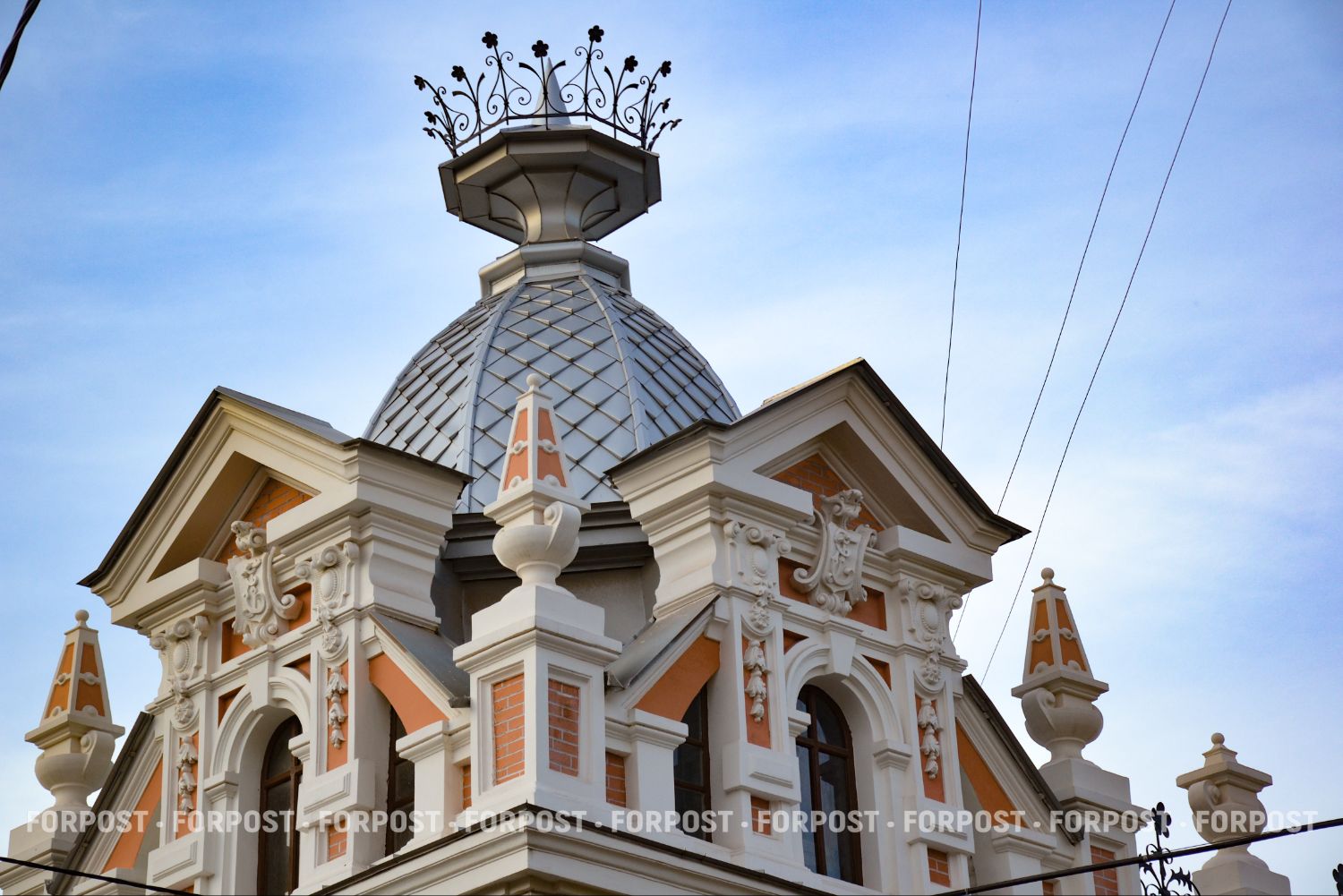 Особняк, построенный в 1905-м, снаружи великолепно оформлен. Чего стоит чешуйчатый купол и аттик, фасады, флакнированные ризалитами, декоративное убранство!