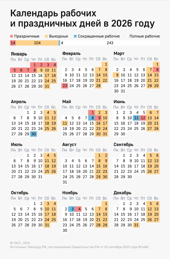 В 2026 году будет 247 рабочих дней и 118 выходных и праздничных.