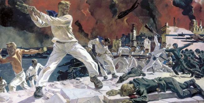 Речь идёт о картине шириной 30 метров и высотой 3,5 метра, которую с уверенностью можно назвать одним из самых масштабных произведений в истории мировой живописи. Александр Дейнека создал его к Всесоюзной художественной выставке, посвящённой 20-летию Победы в Великой Отечественной войне. Доподлинно известно, что художник буквально в «прямом эфире» дописывал фриз (значительно удлинённый формат в изобразительном искусстве) накануне вернисажа.