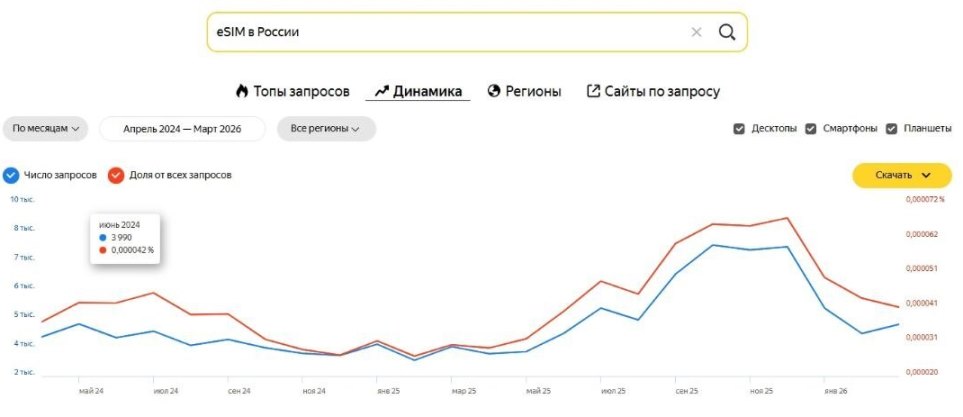 Согласно данным профильного сервиса WordStat, число запросов, касающихся иностранных сим-карт, eSIM, а также их покупки в России, в поисковике «Яндекс» за последний месяц действительно возросло.