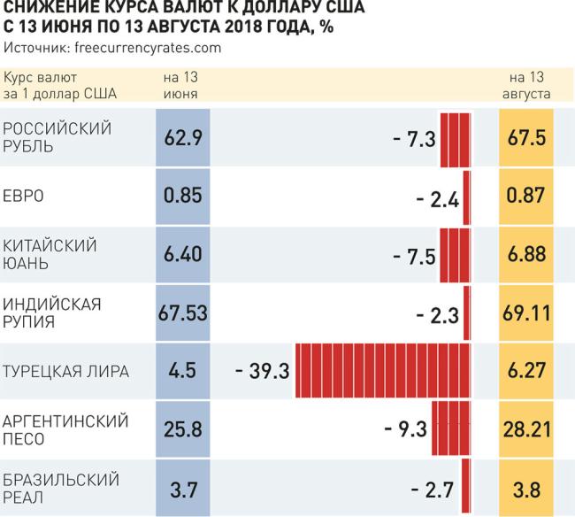 Под угрозой тяжелых последствий торговой войны инвесторы пытаются найти спокойную гавань и бегут в доллар. В результате валюты стран с развивающимися рынками дешевеют. За последние два месяца, с 13 июня по 13 августа, китайский юань обесценился к доллару на 7,5 процента, аргентинский песо - на девять процентов, российский рубль на 7,4 процента. "На рынке царят настроения против развивающихся стран. Потому их валюты идут в одном направлении, но с разной скоростью", - поясняет "Российской газете" старший аналитик "Альпари" Роман Ткачук.