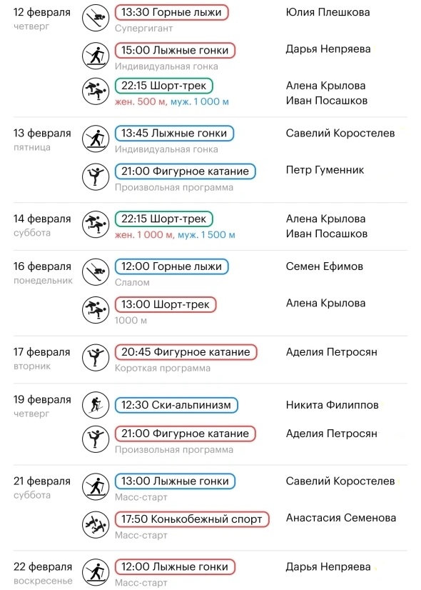 - 13:00. Шорт-трек. Алёна Крылова (1 000 метров, начало четвертьфиналов, при прохождении квалификации — полуфиналы и финалы)