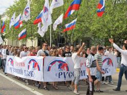 1 мая представители партии Русский блок решили принять участие в совместном с левыми митинге и демонстрации. Собравшись у памятника Екатерине II, активисты Русского блока, выстроившись в колонну, вклинились в шествие, организованное городскими властями и, пройдя мимо трибун с руководством, присоединились к митингу КПУ и СПУ на площади Нахимова.