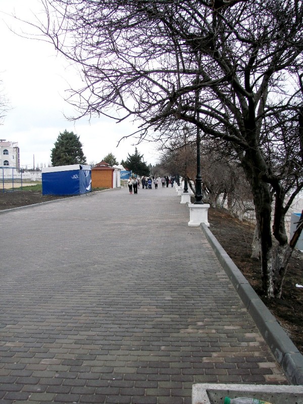 Но вернемся на путь «сталкера». Он плотно утрамбован привычной для севастопольского пейзажа плиткой: все, что ей мешало – снесено и срублено. Скамейки обнаружили в районе ресторана «Тройка» (этот шалман за какие-то неведомые заслуги не снесли), они стоят на открытых местах, где летом солнцепек: отдохнуть в тени не удастся. Хотя хотелось бы видеть лавочки и скамейки вдоль стены и на самом пляже: гуляют там в течение всего года.