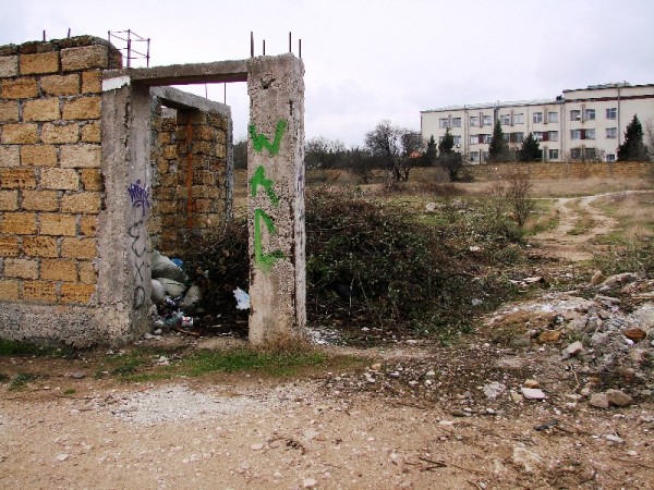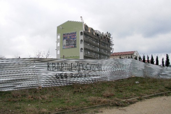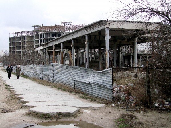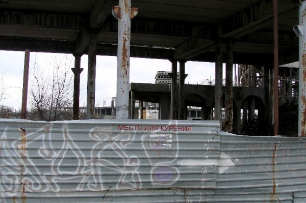 Еще на подходе, утыкаешься в жуткое недостроенное здание, захватившее часть тротуара и огражденное забором, возле которого страшно останавливаться, но приходиться (там остановка). Сверху из забора торчат деревянные бруски, кое-где прикрытые искореженными металлическими листами, и есть опасение, что в один «прекрасный» день они свалятся какому-то «счастливцу» на голову. Прогулочное настроение меняется вместе с возникшим откуда-то чувством «дежа вю».