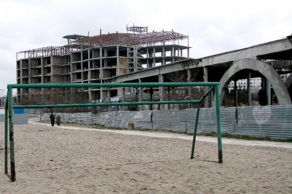 Доходим почти до конца пляжа. Направо пугающая надпись: Объект находится в аварийном состоянии. Вход воспрещен». Слева возвышается устрашающее шестиэтажное сооружение с торчащей ржавой арматурой, накрывающее вечером пляж густой тенью. Так что, любители покупаться на вечерней зорьке, этой зорьки как раз и лишены. Рядом с шестиэтажным монстром – не менее «красочный» одноэтажный. Там же, для любителей «экстрима» - ворота для пляжного футбола (пейзаж, однако!). По-видимому, много лет власти не могут определить, где поставить запятую во фразе: «Строить нельзя снести». Или ждут, что кто-нибудь позарится на эти чудовищные порождения архитекторской мысли? Так может, отдать их бомжам, чтобы окончательно обустроить «Зону»?