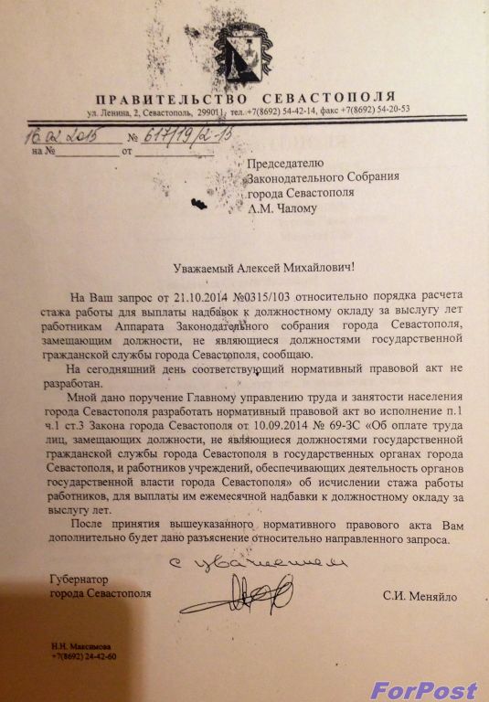 21 октября 2014 года(!) глава Законодательного собрания обращается к главе Правительства Севастополя с вопросом - каков порядок расчета стажа для выплаты надбавок техническим сотрудникам.