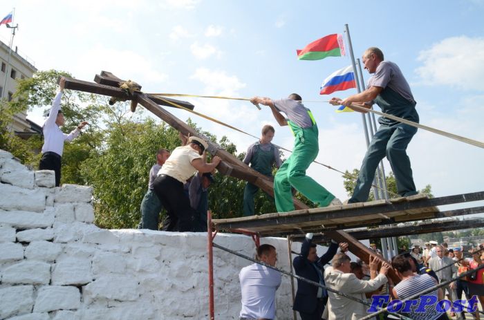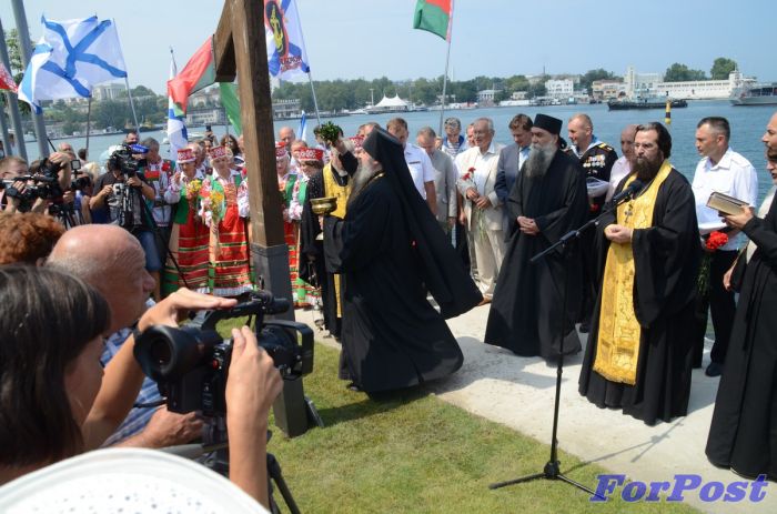 На месте установки креста были построены роты почетного караула от Черноморского флота (ЧФ) России и Военно-морских сил Вооруженных Сил Украины (ВМСУ), торжественно подняли Государственные флаги России, Украины и Беларуси, а военные оркестры ЧФ и ВМСУ исполнили гимны.