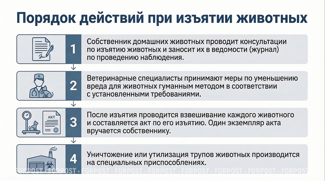 «Изъятие животных проводится при ликвидации очагов особо опасных болезней животных в целях предотвращения распространения возбудителей заразных болезней животных и защиты населения от болезней, общих для человека и животных. Решение об изъятии животных принимается правительством Новосибирской области», — приводит «Интерфакс» позицию регионального правительства.