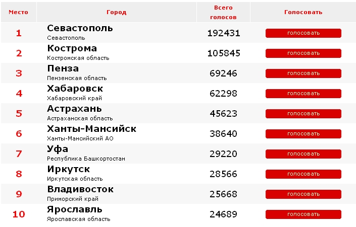В тройку лидеров также входят Кострома (105 тыс голоса) и Пенза (69 тыс. голосов).