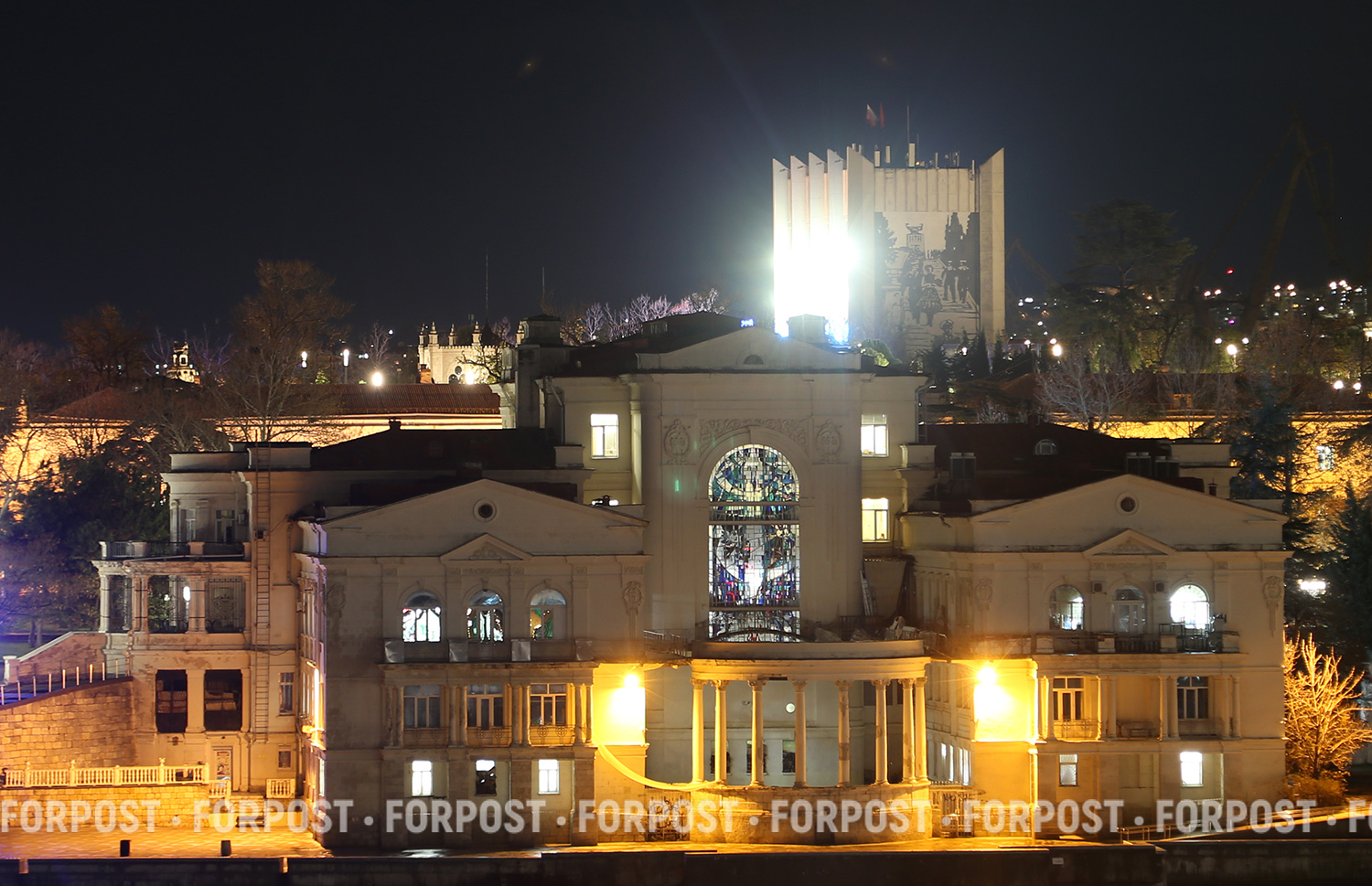 Театр оперы и балета бьёт светом в ночь.