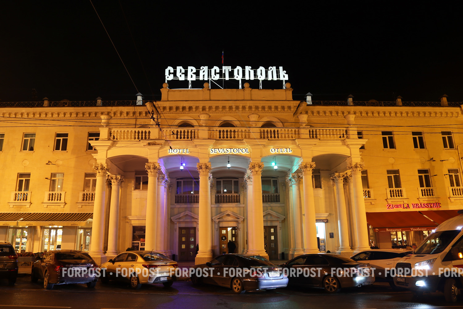 Название гостиницы «Севастополь» ярко выделяется на фоне чёрного неба.