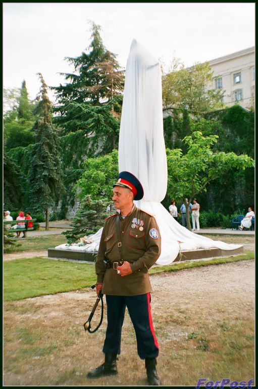 Атаман Черноморской сотни казачьей общины Севастополя "Соболь" Анатолий Анатольевич Марета рассказал, как в ответ на угрозу М. Мамчака (того , что пытался переделать Гимн Севастополя) вместе с татарами свалить памятник, казаки усилили охрану, круглосуточно находясь у памятника