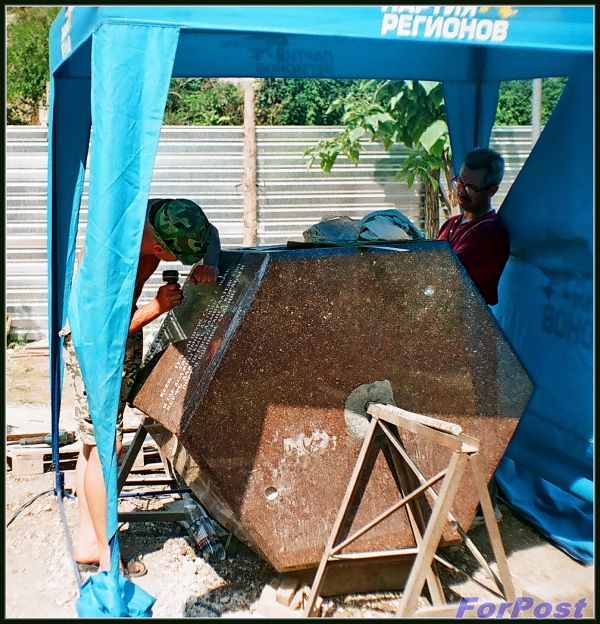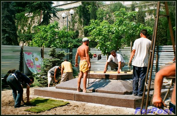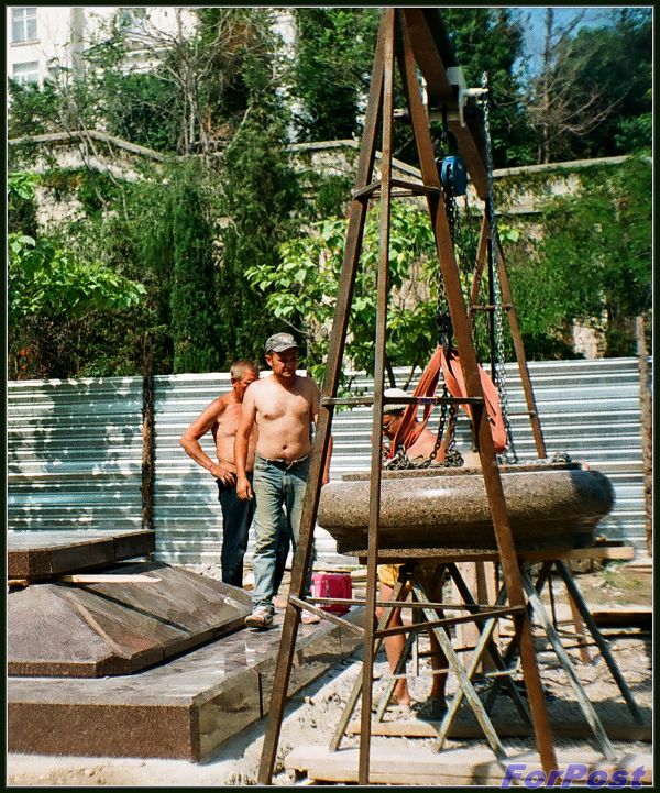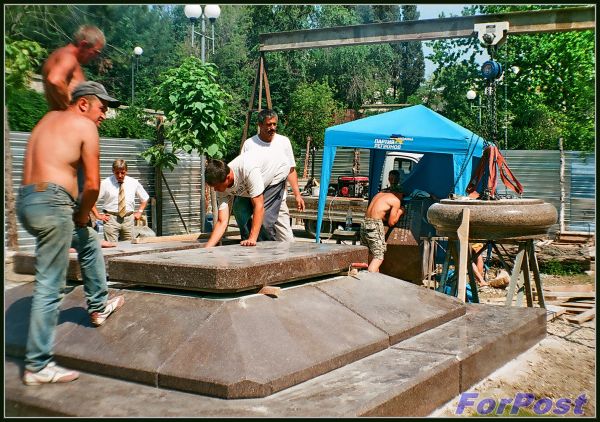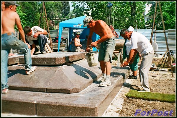 Несмотря на сложность ситуации, какой тогда царил дух единения и патриотизма! В 2008-ом я работала, времени свободного имела очень мало, но всё равно старалась утром или после работы прибежать в сквер сделать пару-тройку снимков ещё плёночным фотоаппаратом. Вот работы по установке памятника: