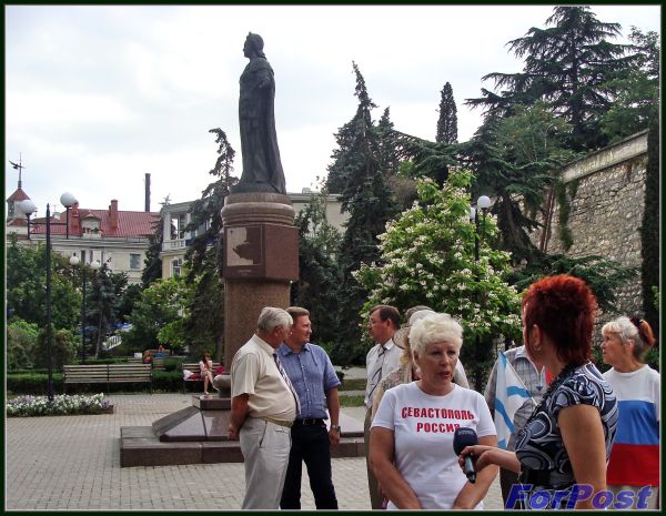 То, что Арсений Вартанович хотел оставить за кадром, озвучила наша пассионария, председатель "Русской общины" Севастополя Татьяна Александровна Ермакова: "Мы очень благодарны Чижу за то, что этот памятник стоит в нашем Севастополе, хотя он всем нам достался с большим трудом. Я помню, в каких драках и в каких мучениях мы его всё-таки удержали..."