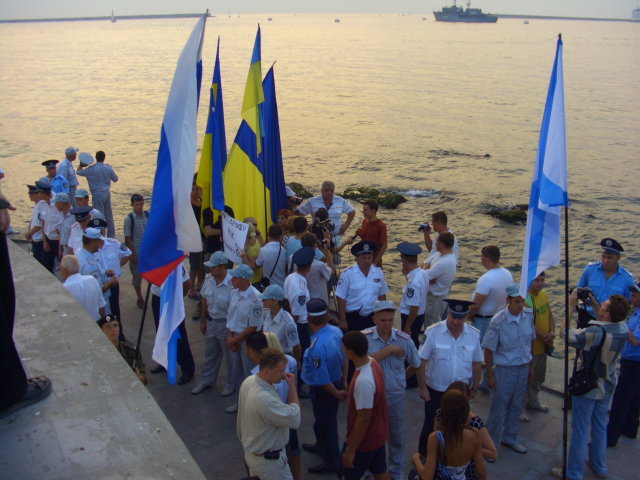 Небольшая группа ребят с желто-блакитными флагами ютилась в районе памятника затопленным кораблям под плотной охраной работников милиции. Еще несколько полуголых бритоголовых хлопцев стояли неподалеку и кидали лобные взгляды на горожан. Один из них попытался бросится на фотокорреспондента, угрожая разбить камеру, но был быстро успокоен севастопольскими милиционерами.
