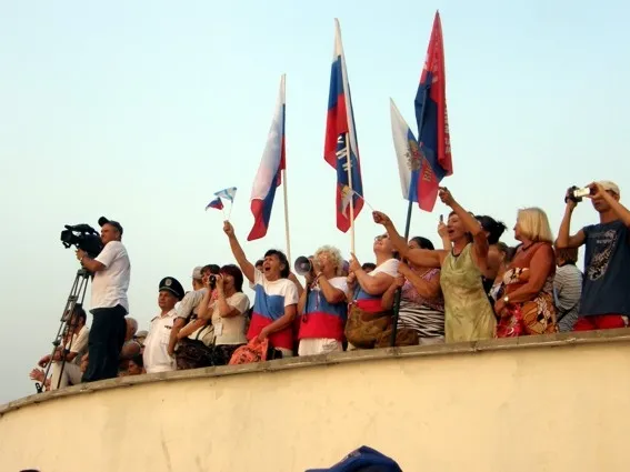 Люди встречали моряков как героев, распевая гимн Севастополя и скандируя «Россия! Россия!». В момент пересечения крейсером боновых ворот со стороны мола грянул фейерверк.
