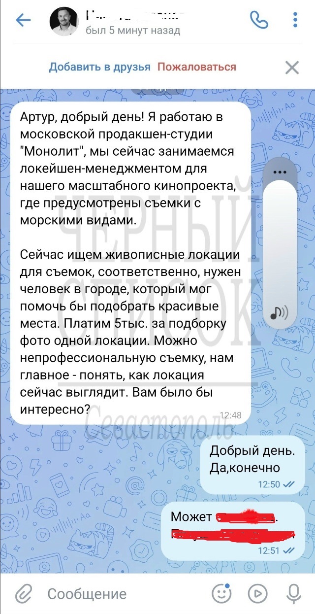 «Спасибо, что написали. Судя по ответам, мы действительно немного не учли специфику региона))) В центральных областях работать попроще, а у вас тут всё весьма сурово). Мне начальство уже сказало, что будет связываться с местными администрациями, чтобы не было вот такого недопонимания», — ответил Денис Б., также предлагавший от имени «московского „Монолита”» вознаграждение за фото (в том числе и непрофессиональные) «незамыленных локаций», которые могут быть использованы для «масштабного кинопроекта на морскую тематику».