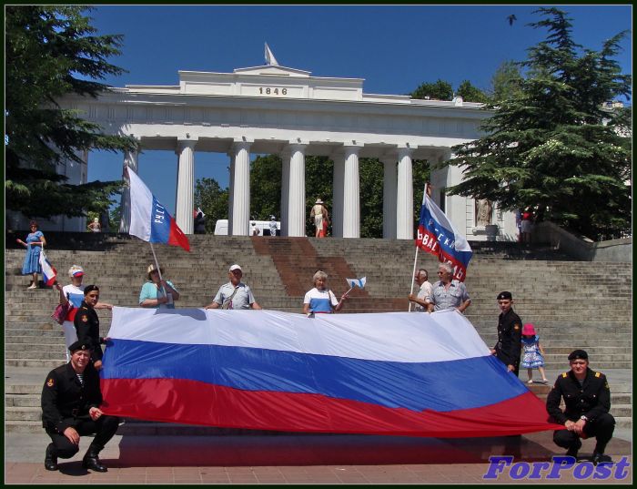 Глупо выглядит люди с российским флагом, на фоне вечного огня защитникам Севастополя, где высечены наименования частей и соединений РККА и в том числе 25 Чапаевской дивизии, которые в Севастополе боролись против белых войск под триколором....