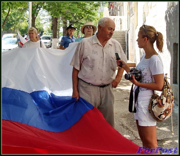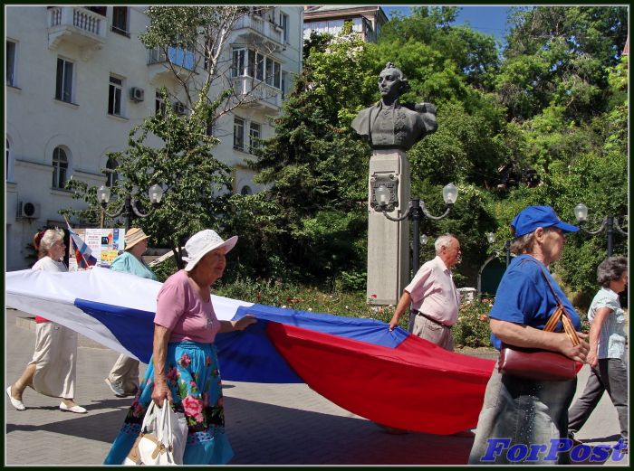 Филиппович, Вы интересный оппонент, и я не хочу Вас терять:-)). Мне не надо талдычить дважды. Вопрос поняла. Отвечаю. Организаторы данной акции - люди разных возрастов, но так как молодёжь была занята на работе и учёбе, пришли пенсионеры. Сама став пенсионеркой, убедилась, что пенсионер пенсионеру рознь. Да, к сожалению, не все, но есть люди адекватные и очень активные до глубокой старости. Не думаю, что это всегда результат упорной работы над собой. Скорее, склоняюсь к тому, что дело в генах. Но не важно. Важно то, что в праздновании Дня России как раз и принимали участие вот такие здоровые и телом, и духом люди. Они не поступаются своими принципами, не отказываются от Отечества, потому что не олицетворяют его с чиновниками, временно захватившими в нём власть, и умеют радоваться. Да, да, радоваться даже в такое смутное время, как наше. Пока есть такие люди, есть и надежда на изменения к лучшему. Об этом говорила и поддержка окружающих. Был лишь один выкрик пьяного с пивом и семАчками на Графской, мол, тута вам Украина и неча!... Я подошла к нему и вежливо попросила всё высказать на камеру для ФорПоста. Он отказался. И, по-моему, правильно сделал.