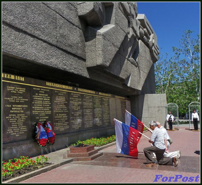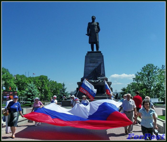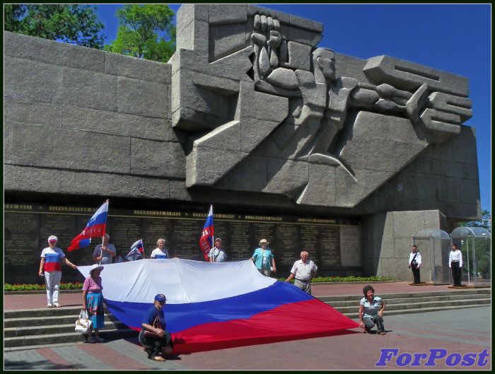 to UFO (Sevastopol) Глупо выглядит люди с российским флагом, на фоне вечного огня защитникам Севастополя, где высечены наименования частей и соединений РККА и в том числе 25 Чапаевской дивизии, которые в Севастополе боролись против белых войск под триколором....
