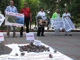 По мнению пикетчиков, промышленная добыча песка у береговой зоны, которую с февраля этого года ведет ООО «Суэста» по разрешению, выданному минэкологии Украины, приведет не только к гибели всей морской экосистемы, но и к обрушению скалистого берега мыса, на котором находятся базы отдыха и дачные поселки.