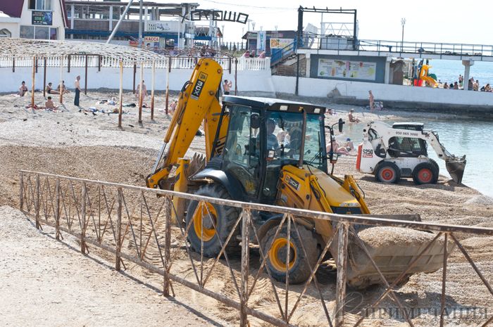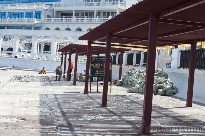 На пляже продолжаются ремонтные работы, что не мешает отдыхающим тут купаться и принимать солнечные ванны.