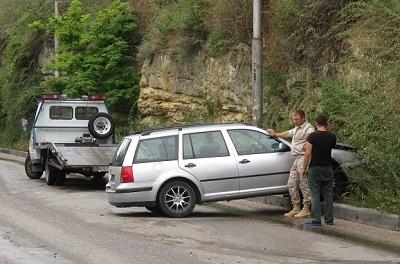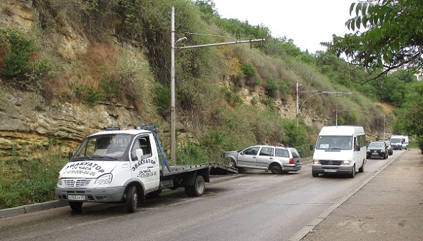 Внезапный дождь, который обрушился днём на Севастополь, сыграл злую шутку с водителем серебристого автомобиля Volkswagen. На Красном спуске машина врезалась в скалу и перекрыла одну полосу движения.