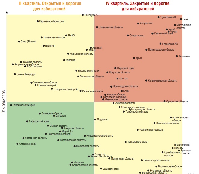 Оценивалось исследователями и соотношение открытости региональных парламентов и расходов на их содержание в 2023-2024 годах. Полученные данные позволили разбить все законодательные органы власти на четыре группы: открытые и дорогие (Санкт-Петербург, Астраханская, Томская, Мурманская и Ульяновская области, Красноярский край и др.), открытые и недорогие (Татарстан, Московская, Ростовская, Самарская, Саратовская области, Алтайский край и др.), закрытые и недорогие (в их числе – Нижегородская, Тульская, Челябинская, Воронежская, Липецкая области) и, наконец, закрытые и дорогие, к числу которых наряду с севастопольским были отнесены парламенты Ленинградской области, Крыма, Калининградской области, Еврейской АО, Калмыкии, Чечни и еще нескольких регионов.