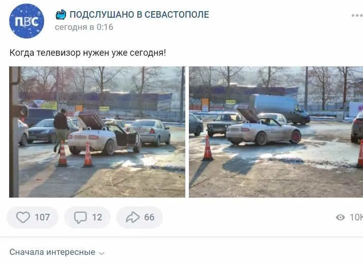 В городской черте атмосфера несколько иная – во второй половине января на дорогах Севастополя был замечен кабриолет, из которого чудом не вываливается огромный телевизор. По словам подписчиков группы «Подслушано в Севастополе», водитель этого автомобиля уже не в первый раз перевозит грузы подобных размеров.
