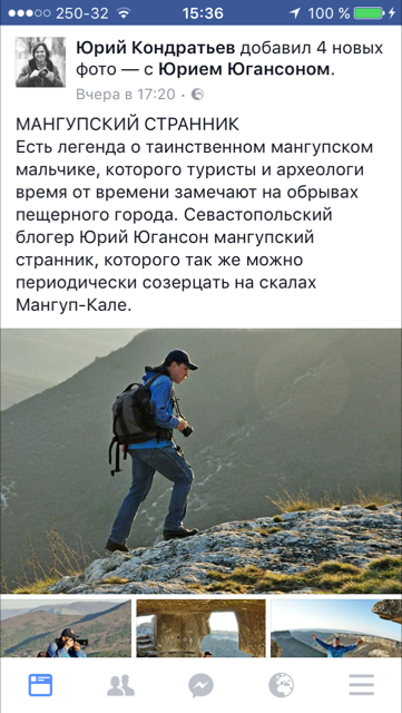 Вы не поверите, но впервые его облик попал в объектив севастопольского фотографа Юрия Кондратьева. Оказалось, что «мангупский мальчик» – вовсе не мальчик, а мужчина – талантливый блогер Юрий Югансон.